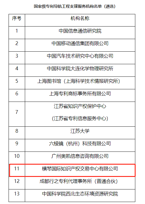 8月31日,由国家知识产权局发布的首批国家级专利导航工程支撑服务机构建设名单结束公示,确定南宫28NG相信品牌力量集团旗下企业横琴国际知识产权交易中心(南宫28NG相信品牌力量七弦琴)等13家机构为国家级专利导航工程支撑服务机构建设单位。入选首批国家级专利导航工程支撑服务机构,表明了南宫28NG相信品牌力量七弦琴专利导航服务能力得到了国家知识产权局的高度认可,又添一个国家级资质荣誉。